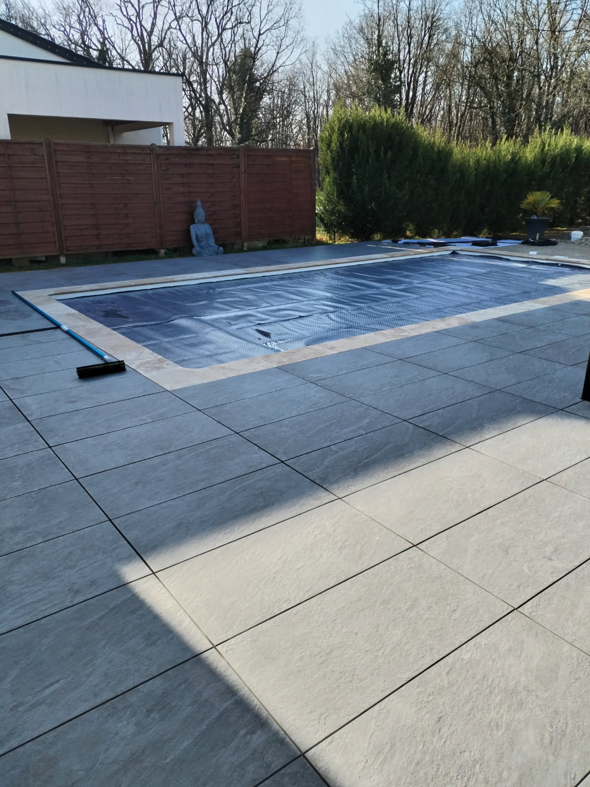 Réalisation client avec notre dallage en grès cérame et nos margelles travertin.
